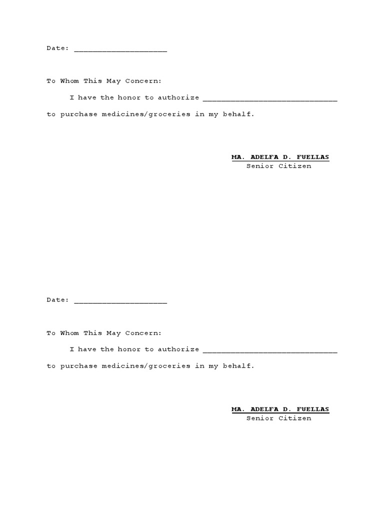 Jun 03, 2021 · sample authorization letter for buying of medicine and other goods of a senior citizen (with discount) through a representative. Per the rule on guardianship of minors (a.m. Sep 14, 2020 · who are eligible to get a senior citizen id? It's a very important document if the primary caregiver is out of town or otherwise not available to authorize treatment. A medical authorization letter is a type of legal document that permits someone, other than one's parent or legal guardian, to authorize medical treatment for a child, senior citizen, or anyone stated in the letter. A medical treatment authorization letter is a legal document that allows someone other than a parent or legal guardian to authorize medical treatment for a child, senior citizen or other person mentioned in the letter. May 29, 2020 · a critical task you should make time for is your business permit application. Senior citizens also need to renew their discount application each year. I know a person who was given a senior citizen card even though the person is not yet a senior citizen. Illinois secretary of state vehicle services department 501 s. A letter stating that you, a senior citizen, has authorized a representative to buy the medicine or other goods on your behalf and avail the senior citizen discount by attaching your senior citizen id and osca booklet. What are the requirements for the senior citizen id application? This document is your proof that you can legally operate in the city or town where your business is located—whether it's a physical store, a courier service, an online shop, or any enterprise.